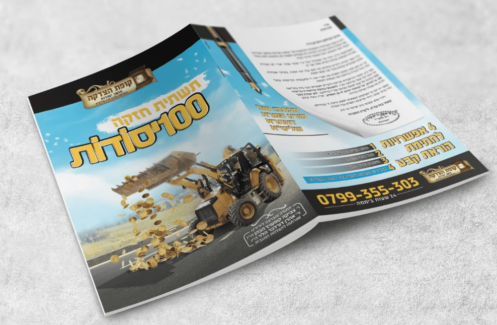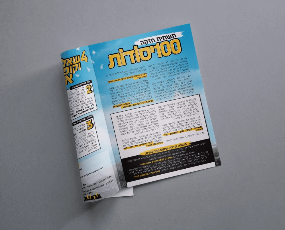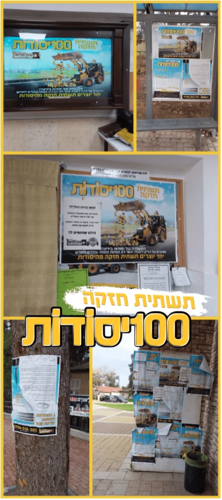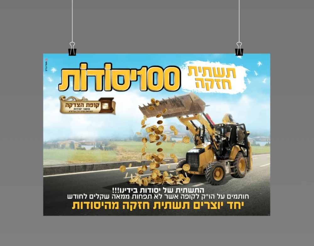 בזמן שעבר המושב שיפוצים והחלפת תשתיות. כל כבישי ושבילי המושב היו מלאים ערימות עפר, טרקטורים, צינורות וכל מה שקשור לבניה, וזה היה "הנושא החם" במושב באותה תקופה… קופת המושב – "קופת יסודות" רצתה לצאת במגבית החתמת הוראות קבע מכל משפחה במושב, כדי לחזק ולבסס את הקופה. המטרה: שכל או רוב המשפחות במושב יחתמו על הו"ק של 100 ש"ח בחודש לטובת הקופה. הרעיון גאוני: תשתית חזקה 100יסודות! לסיכום- המגבית נחלה הצלחה מסחררת רוב המושב חתם על הו"ק ב"ה!!!