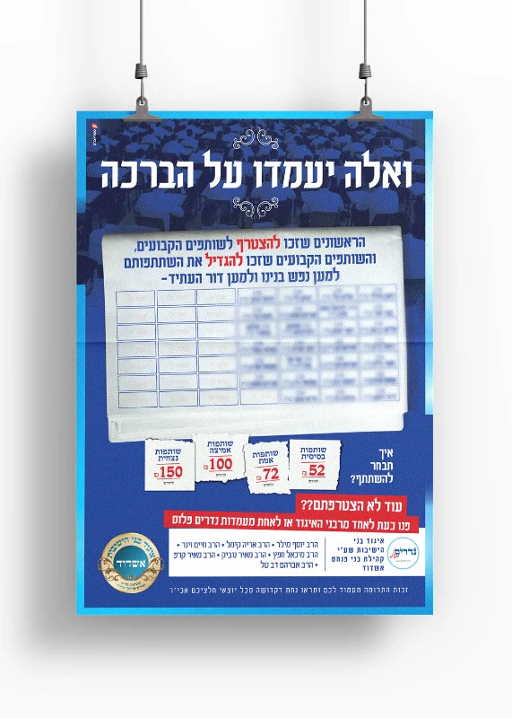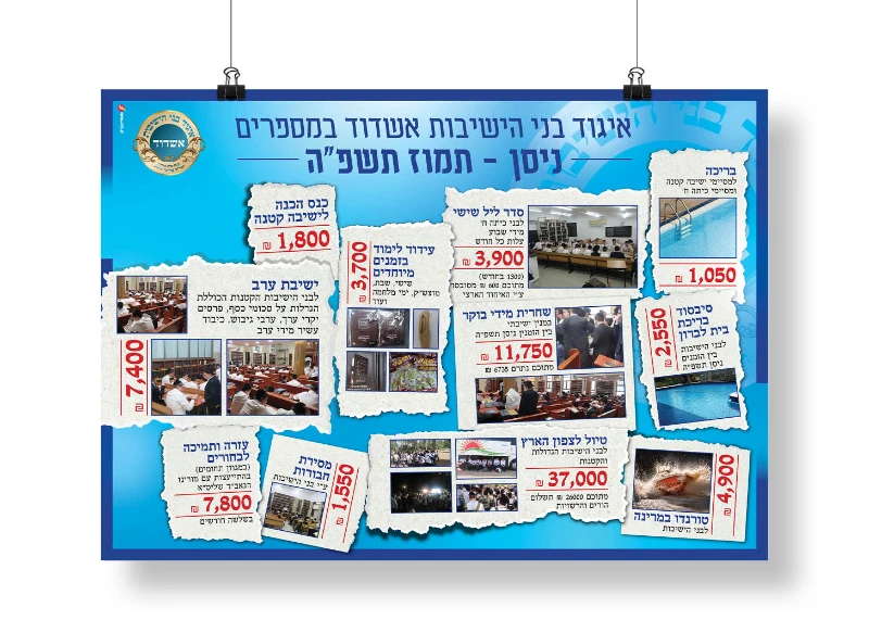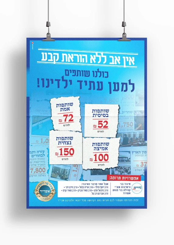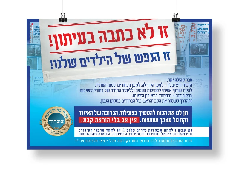 רבני איגוד בני הישיבות רצו להגדיל ולבסס את הוראות הקבע הקבועות של ההורים ובני הקהילה לאיגוד. יצאנו בקמפיין שנחל הצלחה אדירה!! הלקוח בא עם רעיון להראות את פעילויות האיגוד במספרים, על גבי גזירי עיתון. מכאן התקדמנו לרעיון שלם שמדבר בעד עצמו בהמשך הפרסום. ההיענות היתה גדולה מאוד ב"ה ורבים חתמו על הו"ק לאיגוד. המודעה שעשתה הכי הרבה עבודה היתה דוקא המודעה הסופית שבה ברכנו ופרסמנו את התורמים. דבר שיצר סחף ורצון להיכלל בין השמות ופשוט עוד ועוד אנשים הצטרפו והשם שלהם נוסף למודעה (הכנו מקומות ריקים מראש)